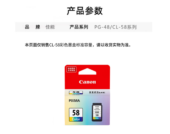 參數(shù) [品牌] 佳能 [型號(hào)] CL-58 [毛重] 60.00g [產(chǎn)地] 中國大陸 [類型] 帶頭墨盒 [單位] 個(gè)